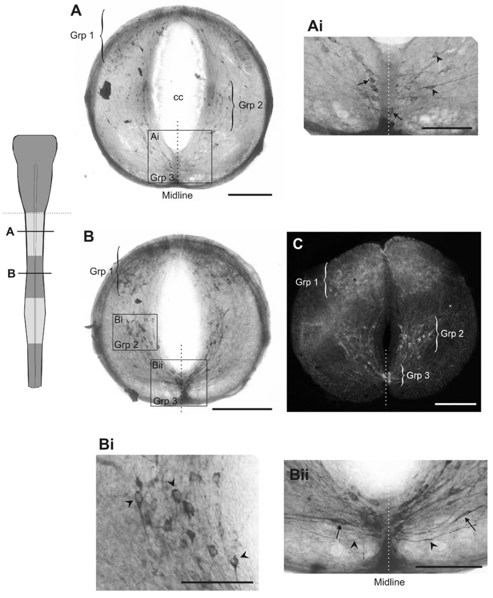 group (Grp 2) of multipolar neurons with axonal processes that project both dorsally and ventrally; a third ventral group (Grp 3; magnified in Aii) consisting of