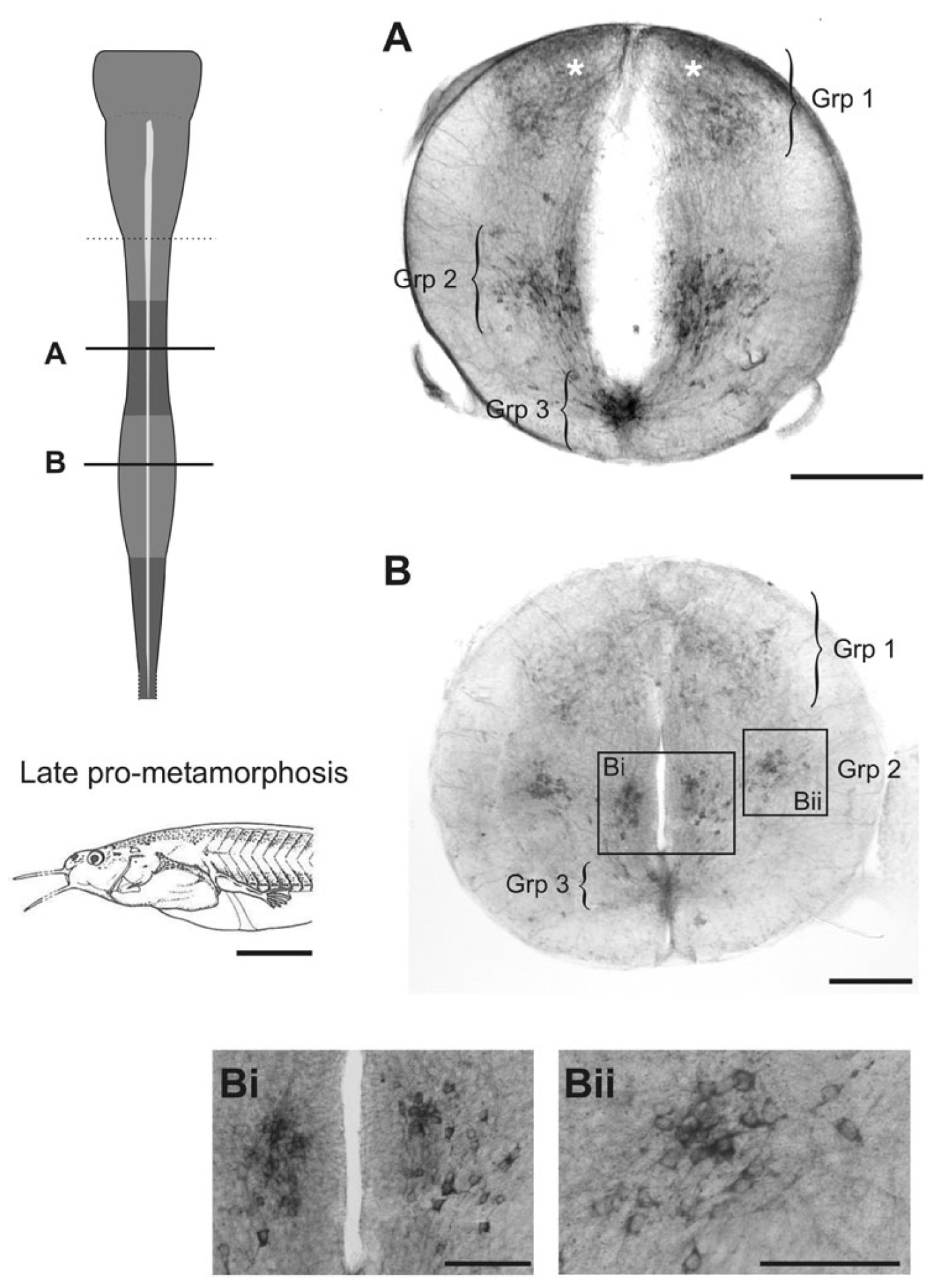 comparison to early pro-metamorphic stages, Group 2 neurons now divide into distinct subgroups (seen at higher magnification in Bi and ii). Scale bars, 500 lm (A