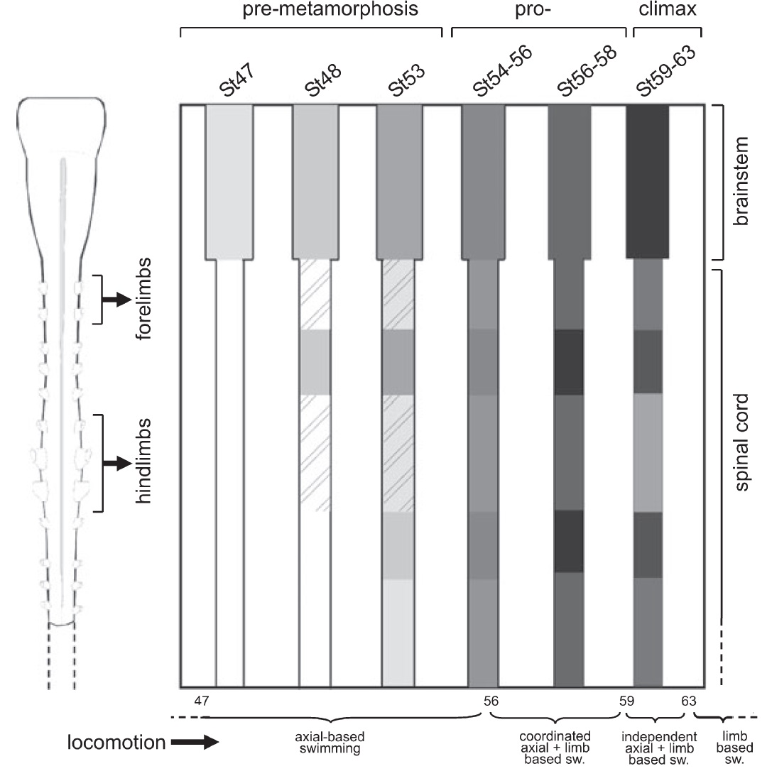 sequence of appearance and intensity (as a function of shading) of NADPH-d neuronal staining in the brainstem and spinal cord in representative metamorphic
