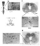 spindle-shaped neurons (arrowhead) that send axonal processes bilaterally, many of which cross the midline. (B) In the lumbar region, labelling continues to occur