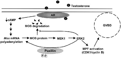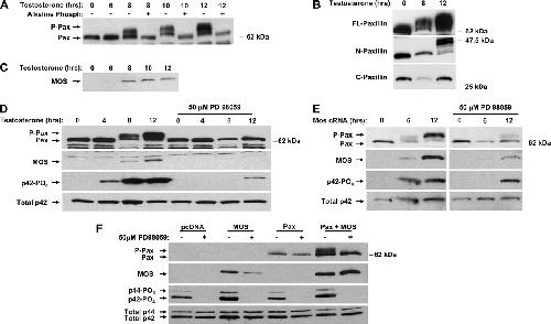 FIGURE 4. Paxillin is phosphorylated late during maturation in a MEK-dependent fashion. A, oocytes were stimulated with 1 M testosterone (to ensure