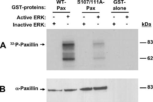 FIGURE 6. p42 ERK phosphorylates Paxillin in vitro. A, GST fusion proteins