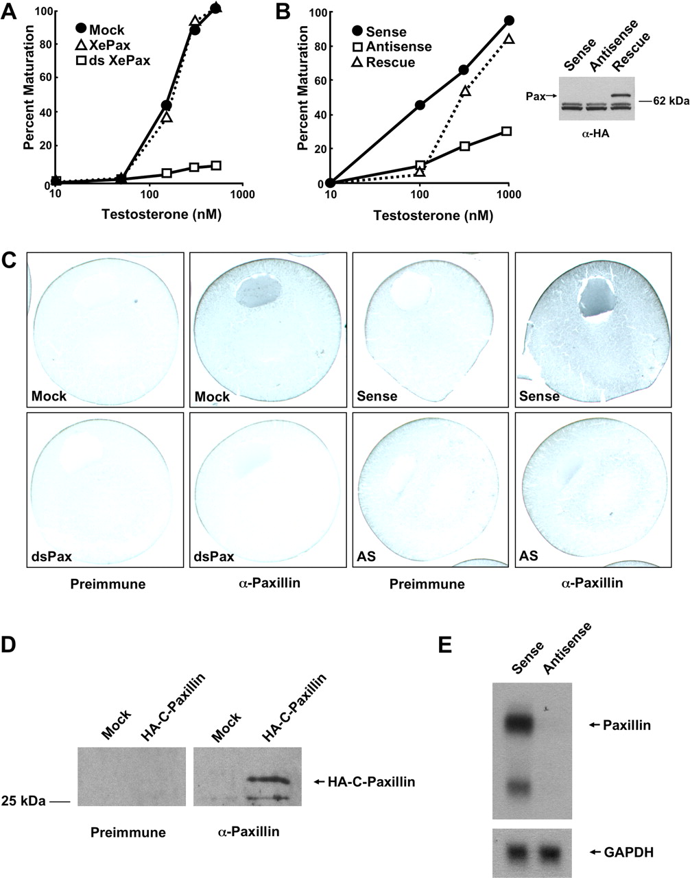 FIGURE 2. Paxillin is required for steroid-induced oocyte maturation. A, oocytes were injected with HAtagged
