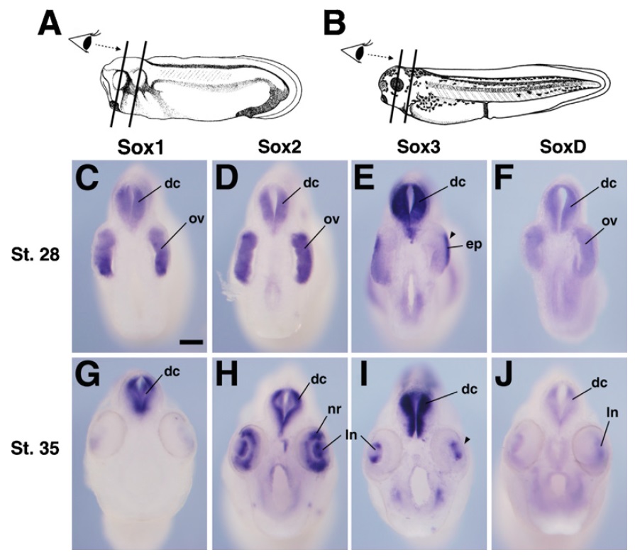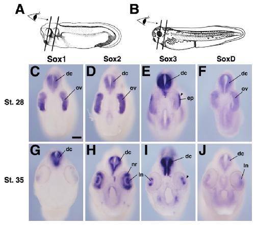 35). Sox1–3 and SoxD were expressed in the diencephalon at stage 28 (C–F). Sox1, Sox2, and SoxD were also expressed in the optic vesicle (C,D,F). Sox3
