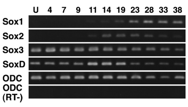 until stage 38. Sox3 and SoxD transcripts were detected in unfertilized