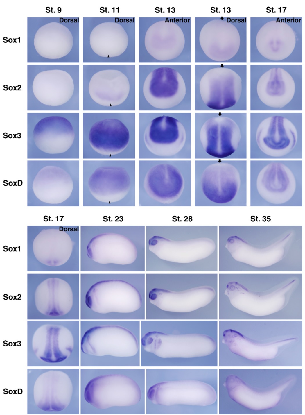 Fig. 3. Spatial expression patterns of Sox1â3 and SoxD revealed by whole-mount in situ hybridization. In dorsal views of stage 13 and 17, the anterior is