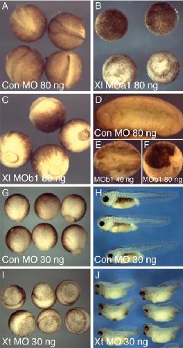 Fig. 2. Down-regulation of NRH1 proteins causes defects in gastrulation. (A) X. laevis embryos were injected at the one-cell stage with 80 ng of a control MO, or Xl MOa1 or Xl MOb1. Embryos shown are at the equivalent of neurula stage 16. Note that embryos injected with control MO develop normally, while those injected with Xl MOa1 (B) or Xl MOb1 (C) do not complete gastrulation normally. (D) Embryos injected with 40 or 80 ng Xl MOb1 as indicated, shown at the equivalent of stage 28. Embryos injected with Xl MOb1 tend to disaggregate and arrest development so as to resemble those at gastrula or neurula stages (E, F). (G) X. tropicalis embryos injected with Xt MO show a similar phenotype to that observed in X. laevis embryos. (G, H) Embryos injected with 30 ng of a control antisense morpholino oligonucleotide develop normally, while those injected with 30 ng Xt MO do not complete gastrulation normally (I) and go on to exhibit anterior and posterior truncations (J).