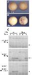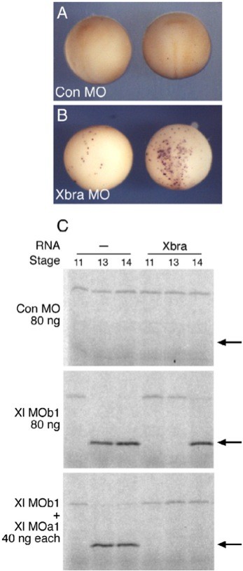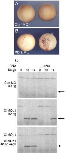 Fig. 8. Apoptosis in embryos injected with NRH1 antisense morpholino oligonucleotides is delayed or prevented by injection of RNA encoding Xbra. (A, B) Inhibition of Xbra function by injection of a specific MO causes limited apoptosis. (A) TUNEL staining of embryos injected at the one-cell stage with 80 ng control MO and cultured to stage 14. Note the absence of apoptosis. (B) TUNEL staining of embryos injected with 80 ng Xbra MO. Note apoptotic cells. (C) Injection of RNA encoding Xbra delays or rescues apoptosis induced by NRH1 MOs. Embryos were injected at the one-cell stage with 80 ng of a control MO or with Xl MOb1 or Xl MOa1 as indicated. They then received, at the 2- cell stage, a total of 50 pg Xbra RNA injected at four positions in the equatorial region. Embryos were cultured for equivalent times to the indicated stages, and extracts were assayed for the ability to cleave tPARP. Note that the onset of caspase activity is delayed or prevented by Xbra. This experiment has been carried out twice, with the same result both times.