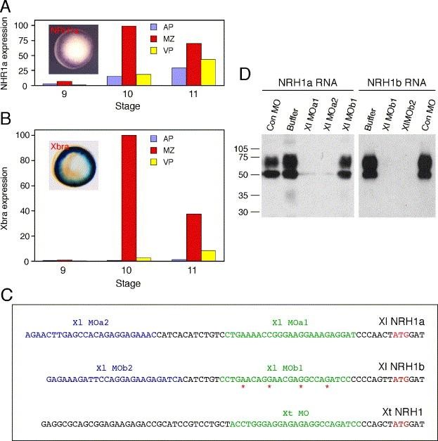 Fig. 1. Expression pattern of NRH1a and the design of NRH1 antisense morpholino oligonucleotides (MOs). (A) Expression pattern of NRH1a. RNA was extracted at the indicated stages from animal pole (AP), marginal zone (MZ) and vegetal pole (VP) regions, and the expression of NRH1a and ornithine decarboxylase (ODC) was analysed by real-time RT-PCR and normalised to levels of total RNA, with maximum observed expression defined as 100. Note significant levels of NRH1a expression in animal and vegetal pole regions. The inset shows expression of NRH1a at early gastrula stage 10 analysed by in situ hybridisation. There are high levels of NRH1a expression in the marginal zone, as previously reported (Bromley et al., 2004). (B) Expression pattern of Xbra, analysed and normalised as described for (A). Note that expression of this gene in animal pole and vegetal pole regions is lower than that of NRH1a. (C) The design of antisense morpholino oligonucleotides directed against NRH1 gene products in X. laevis and X. tropicalis. The initiating ATGs of X. laevis NRH1a and NRH1b and of X. tropicalis NRH1 are shown in red, preceded by their 5â² untranslated sequences. The sequences targeted by the indicated antisense morpholino oligonucleotides are coloured blue or green. A control MO differs by four bases (starred) from Xl MOb1. (D) Efficacies of the antisense morpholino oligonucleotides. Embryos were injected with 40 ng of the indicated MOs at one-cell stage, and 500 pg RNA encoding HA-tagged versions of NRH1a or NRH1b was injected at the two-cell stage. Embryos were cultured until mid blastula stage 8, and extracts were subjected to western blotting using an anti-HA antibody. All four X. laevis MOs block the translation of their cognate RNA while the control MO has little or no effect.