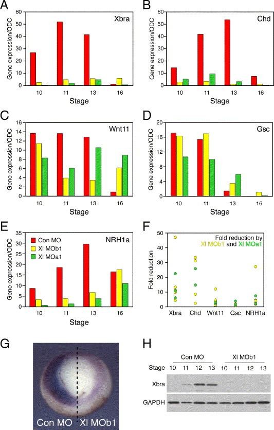 Fig. 6. Gene expression in embryos lacking NRH1 function. (AâE) Xenopus embryos were injected at the one-cell stage with 80 ng of a control MO or of Xl MOa1 or Xl MOb1. They were then assayed by real-time RT-PCR at stages 10, 11, 13 or 16 for expression of Xbra (A), Chordin (B), Xwnt11 (C), Goosecoid (D) or NRH1a (E). All values were normalised to those of ornithine decarboxylase and are presented as arbitrary units. Note that levels of Xbra, Chordin and NRH1b are substantially reduced by inhibition of NRH1 activity. (F) Scatter graphs summarising the results of four independent experiments investigating gene expression levels in embryos in which NRH1 activity is inhibited. The results show the fold reduction in gene expression caused by NRH1 MOs (such that a value of 1 would indicate no difference between control embryos and embryos injected with Xl MO1a or Xl MOb1). The ratios were calculated at the stage at which each gene was expressed at its maximum level (for example, at stage 11 for Xbra and stage 13 for Chordin). (G) Xenopus embryos were injected at the two-cell stage with 40 ng control MO into one blastomere and 40 ng Xl MOb1 into the other. The control and experimental sides of the embryos were distinguished by co-injection of 4 ng Lissamine-labelled control MO or fluorescein-labelled control MO. Embryos were allowed to develop to early gastrula stage 10 when they were analysed by in situ hybridisation using a probe specific for Xbra. Note that levels of Xbra are lower in the descendants of the blastomere injected with Xl MOb1 (right). Nine experiments of this kind have been carried out, together with five where one side of the embryo was injected with Xl MOb1 and the other left uninjected and six where one side of the embryo was injected with control MO and the other left uninjected. Only in the latter group were levels of Xbra similar in the two halves of the embryo. (H) Western blot of extracts from embryos injected at the cell stage with 80 ng of a control MO or Xl MOb1, probed with an antibody specific for Xbra (upper panel) or GAPDH (lower panel). Note that levels of Xbra are greatly reduced by inhibition of NRH1 protein function.