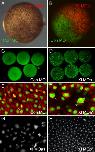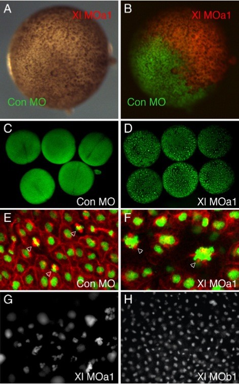 Fig. 3. Antisense morpholino oligonucleotide Xl MOa1 causes defects in nuclear division. (A, B) One cell of an X. laevis embryo at the two-cell stage was injected with 40 ng control MO together with fluorescein-dextran (green), and the other cell was injected with Xl MOa1 together with rhodamine-dextran (red). Note that Xl MOa1 causes retardation of cell division. (C, D) By neurula stage 14, embryos injected with Xl MOa1 have many fewer cells than control embryos and larger nuclei. DNA is stained with SYTOX green. (C) Embryo previously injected at the one-cell stage with 80 ng control MO. (D) Embryo injected with 80 ng Xl MOa1; note the smaller number of much larger nuclei. (E, F) Higher magnification of cells in the animal pole regions of such embryos at mid gastrula stage 11. DNA is stained by SYTOX green and tubulin by means of an antibody against β-tubulin (red). (E) Embryo injected with 80 ng control MO. Note normal metaphase figures (arrowheads). (F) Embryo injected with Xl MOa1. Note mitoses with multiple spindles (arrowheads). (G, H) In a separate experiment, embryos injected with 80 ng Xl MOa1 also show abnormal mitosis (G), but cells in an embryo injected with the same amount of Xl MOb1 appear normal.