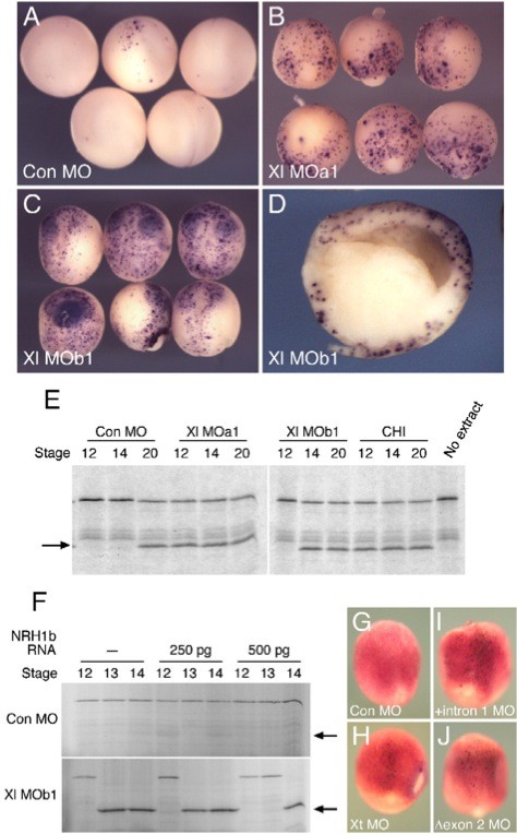 Fig. 5. Apoptosis in embryos injected with NRH1 MOs. (A) Whole-mount TUNEL assays of X. laevis embryos at stage 14 reveal low levels of apoptosis in embryos injected with 80 ng of a control MO and high levels in embryos injected with 80 ng Xl MOa1 (B) or Xl MOb1 (C). (D) An embryo injected with 80 ng Xl MOb1 and bisected at stage 14. Anterior is to the right. Note high levels of apoptosis in dorsal and ventral mesoderm and in ectoderm. (E) Apoptosis in Xenopus embryos analysed by a tPARP cleavage assay. Arrows indicate the major tPARP cleavage product, which indicates the presence of active caspases. Note that apoptosis is detectable in embryos injected with a control MO at stage 20, but occurs earlier in embryos injected with NRH1 MOs and, as a positive control, in embryos treated with cycloheximide (CHI). (F) The premature onset of apoptosis in embryos injected with Xl MOb1 is delayed by subsequent injection of 500 pg RNA encoding NRH1b. (G) Inhibition of NRH1 function in X. tropicalis also causes apoptosis. Embryos were injected with our control MO (G), with Xt MO (H) or with MOs designed to prevent correct splicing of NRH1 mRNA in X. tropicalis (I, J; see Fig. 7) and were analysed by TUNEL staining at stage 13. Note increased levels of apoptosis in panels H, I and J. This experiment has been carried out three times using Xt MO and once using +intron 1 MO and δexon 2 MO, with the same result obtained each time.