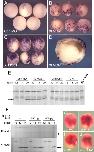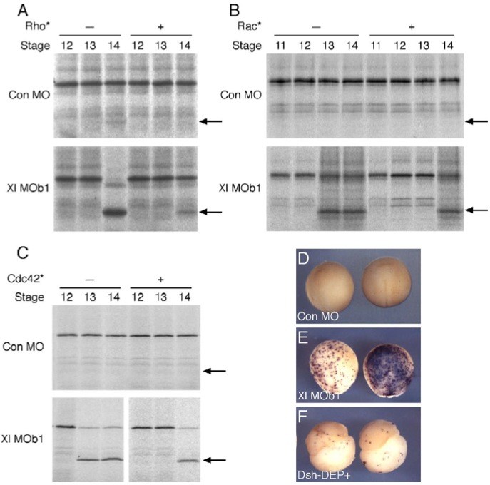 Fig. 9. Apoptosis in embryos injected with NRH1 antisense morpholino oligonucleotides is delayed or prevented by injection of RNA encoding active forms of the small GTPases Rho, Rac or Cdc42. (A) Embryos were injected at the one-cell stage with 80 ng of a control MO or of Xl MOb1 as indicated, and at the 2- to 4-cell stage, they were injected at four equatorial positions with RNA encoding constitutively active forms of Rho, Rac or Cdc42 (5, 50 and 30 pg per embryo, respectively). They were cultured to the indicated stages, and extracts were assayed for the ability to cleave tPARP. Note that the onset of caspase activity is delayed by active forms of all three small GTPases. With the exception of the experiment involving Rac, these experiments have been carried out twice, with the same results both times. (D). Inhibition of the planar cell polarity pathway, and the resulting disruption of gastrulation, does not cause dramatic apoptosis. Embryos were injected at the one-cell stage with 80 ng of a control MO (D), or with 80 ng of Xl MOb1 (E). In panel F, 3.6 ng RNA encoding Dsh-DEP+, a dose that is sufficient severely to disrupt gastrulation, was delivered by four equatorial injections made at the 2- to 4-cell stage. They were cultured to stage 14 and subjected to whole-mount TUNEL staining. Note that, in contrast to embryos injected with Xl MOb1 (E), little apoptosis occurs in embryos injected with RNA encoding Dsh-DEP+ (F). Note that the experiments in panels D were carried out at the same time as those illustrated in Figs. 8A, B, and the control embryos in Fig. 8A and panel D are identical.
