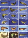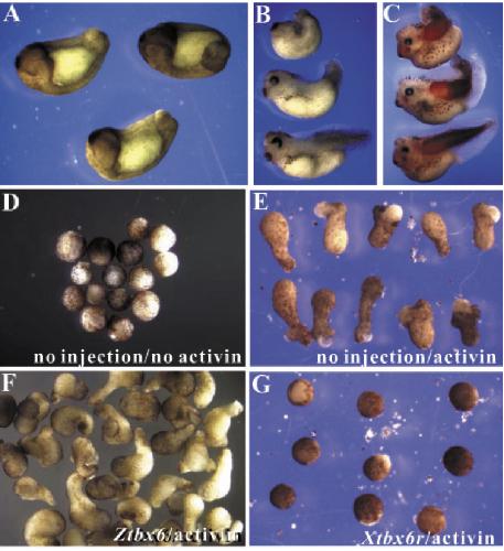 Fig. 5 (Left). Overexpression of Xtbx6r inhibits convergent extension movements. (A-C) Xtbx6r mRNA (200 pg/embryo) was injected into two dorsal blastomeres of 4-cell stage embryos. (A) st.24, (B) st.35, (C) st.38, stained with 12/101 monoclonal antibody. (D-G) Effect of Xtbx6r on convergent extension elicited by activin. mRNA doses were Xtbx6r: 150 pg, Ztbx6: 400 pg and the activin concentration was 2.0 ng/ml. Explants were photographed at st.19.