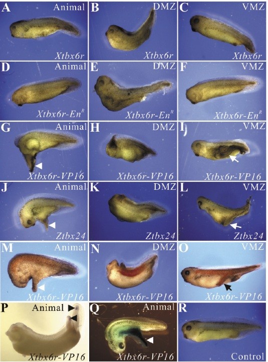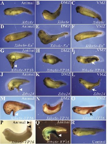 Fig. 6 (Right). The effect of overexpression of Xtbx6r and its derivatives or Ztbx24 on development. (A-Q) mRNA was injected into the animal (Animal), dorsal (DMZ), or ventral (VMZ) region. (M-O) Immunohistochemistry with 12/101 monoclonal antibody. (P) Xtbx6 expression was detected by whole-mount in situ hybridization (black arrowheads). (Q) Embryos were injected with Xtbx6r-VP16 mRNA and nlacZ mRNA and stained with X- Gal. White arrowhead indicates ectopic tail-like structures. Black arrow displays the secondary axis.
