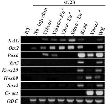 Fig. 8. Comparison of neural inducing activities among T-box genes. Injected mRNA and its doses are, Xtbx6r (200pg), Xtbx6r-EnR, Xbra- EnR, Xtbx6-EnR (100 pg, respectively), B306 (1.8ng), Xbra3 (200 pg).