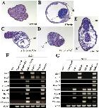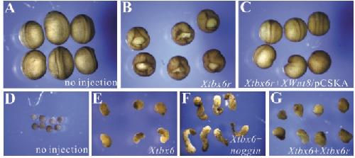 Fig. 9. Relationship between Xtbx6r and BMP or Wnt signaling. (A-C) Indicated genes were overexpressed dorsally. (D-G) Animal cap explants. Injected mRNA and its doses were: (A) no injection, (B) Xtbx6r (50 pg), (C) Xtbx6r (50 pg) and XWnt8/pCSKA plasmid (50 pg), (D) no injection, (E) Xtbx6 (200 pg), (F) co-expression of Xtbx6 (200 pg) and noggin (100 pg), (G) co-expression of Xtbx6 (200 pg) and Xtbx6r (50 pg).