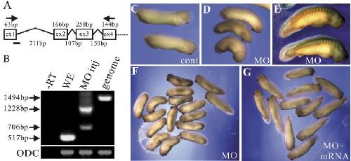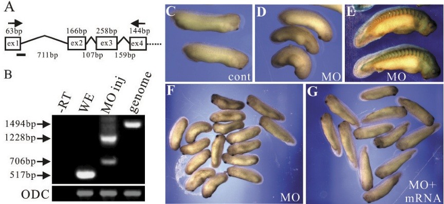 trol embryos. (D) MO-injected embryos. (E) MO and nlacZ mRNA-coinjected embryos were stained with X-Gal and carried out immunohistochemistory with 12/101 antibody. (F) MO (25 ng) injected embryos. (G) MO (25 ng) and short splicing variant mRNA (100 pg)-coinjected embryos.