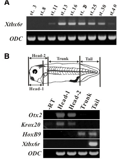 Fig. 2. Expression profile of Xtbx6r. (A) Temporal expression of Xtbx6r as revealed by RT-PCR at indicated stages. Ornithine decarboxylase (ODC) was used as loading controls. (B) Spatial expression of Xtbx6r was examined by RT-PCR at st.33. Embryos were dissected into four frag- ments (head-1, head-2, trunk, tail) as shown and analyzed by RT-PCR for expression of the indicated genes.