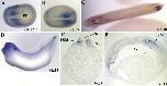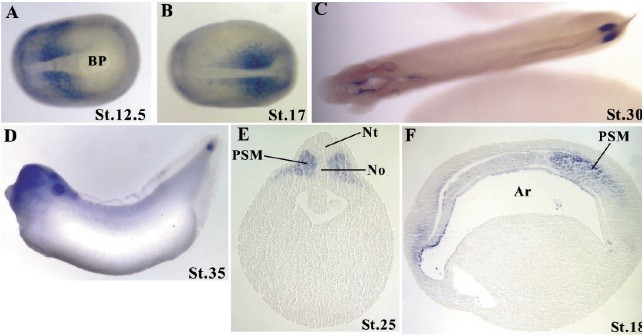 Fig. 3. Spatial expression pattern of Xtbx6r revealed by in situ hybridization. (A-C) Dorsal view. (D) Lateral view. (A-D) Anterior is to the left. (E) Transverse sections, dorsal is to the top. (F) Parasagittal sections, anterior is to the left. Ar, archenteron; Bc, blastocoel; Bp, blastopore; No, notochord; Nt, neural tube; PSM, presomitic mesoderm