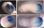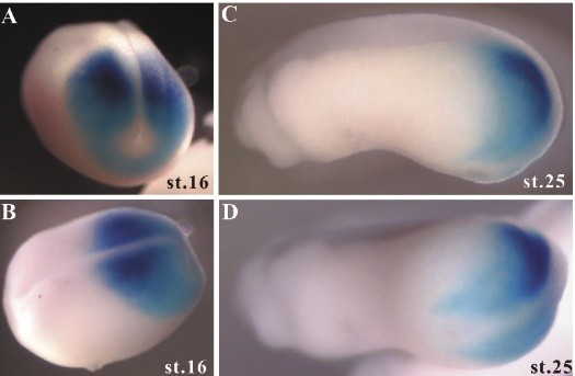 Fig. 4. Comparison of expression of Xtbx6r and Xtbx6 by double in situ hybridization. (A-D) Xtbx6r expression was detected with MagentaPhos, while Xtbx6 expression (turquoise) was detected with BCIP. Since the area of Xtbx6r expression was completely included in the Xtbx6 area, there is no magenta domain and the overlap is stained in dark blue. (A) Posterior view. (B) Dorsolateral view. (C) Lateral view. (D) Ventrolateral view.