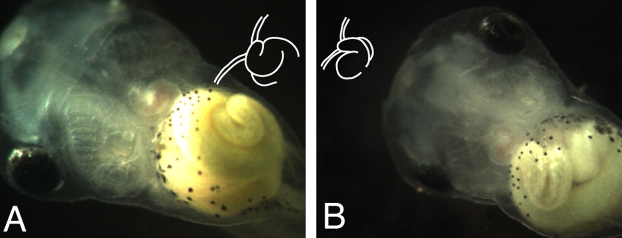 Fig. 9. BDM treatment can randomize cardiac and gutleft-right patterning. (A) An untreated stage-47 tadpole displays normal situs of heart and gut coiling. (B) A tadpole exposed to 20 mmol/l BDM for 20 minutes during the first cell cycle displays reversed cardiac and gut organizations, with otherwise normal body patterning. Insets show outlines of normal (A) and reversed (B) cardiac outflow tract and ventricle.