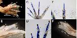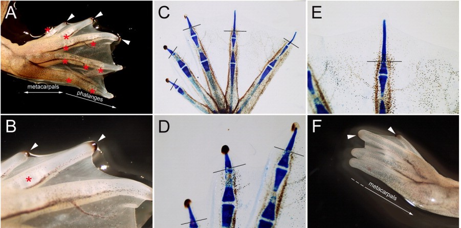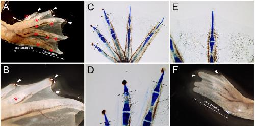 Figure 7. Digit amputation experiment. A: Dorsal view of regenerated digits. B: Higher magnification of A. C: Skeletal pattern of regenerated digit. D,E: Higher magnification of C. Regenerates were observed as spikes. No joint was observed in the digit spikes. Nails were observed in the anterior three spikes but not in the posterior two spikes. F: Spikes with a nail were formed in metacarpal-level amputation. White arrowheads indicate the nail. A,B: Asterisks mark joints, and white arrowheads indicate the nail. Lines in C-E indicate the amputation site.