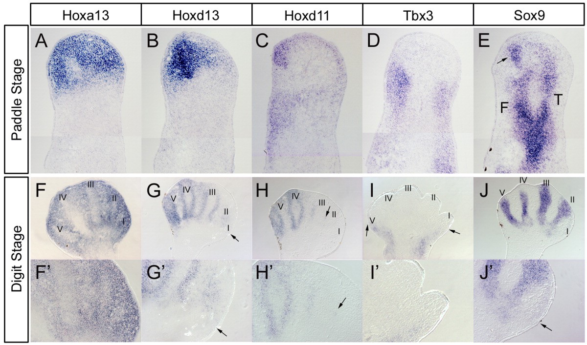 Figure 2. Gene expression in the Xenopus developing hindlimb. A-E: Gene expression in the forelimb bud at the paddle stage (Nieuwkoop and Faber stage 52). A:Hoxa13 expression. Digitcartilage started to differentiate and hoxa13 expression was downregulated (compare with 3E). B:hoxd13 expression. In the anterior domain, weak but clear expression of hoxd13 was detected. C:Hoxd11 expression. The expression pattern was similar to the pattern in the forelimb (compare with 2C, 3C). D:Tbx3 expression. Expression of tbx3 was present in both the anterior and posterior margins.E:Sox9 expression. The first differentiating digitcartilage was observed (arrow). T; tibia (tibiale). F; fibula (fibulare). F-J: Gene expression in the forelimb bud at the digit stage (Nieuwkoop and Faber stage 54). F:Hoxa13 expression. Hoxa13 expression remained throughout the autopodium.G:hoxd13 expression. In the anterior domain, weak but clear expression of hoxd13 was still detectable (arrows in G,G'). H:Hoxd11 expression. Arrows in H and H' indicate the expression border. I:Tbx3 expression. Arrows in I indicate the expression border. J:Sox9 expression. The cartilage of putative digit I was just starting to express sox9 (arrow in J'). F'-J': Higher magnification of each figure. II-V are the digit numbers suggested by our results. Distal is to the top, and anterior is at the left.