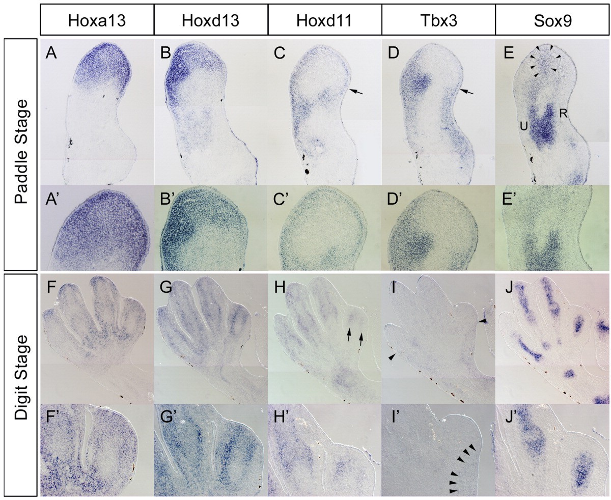 Figure 3. Gene expression in Xenopus developing forelimb. A-E: Gene expression in the forelimb bud at the paddle stage. A:Hoxa13 expression. B: Hoxd13 expression. Hoxd13 expression in the posterior region was stronger than that in the anterior region. C:Hoxd11 expression. Hoxd11 expression was detected in the autopodium. The expression domain in the autopodium was restricted to the subectodermal region. Hoxd11 was detectable in the anteriormost region of the autopodium (arrow). D:Tbx3 expression. Expression of tbx3 was present in both the anterior and posterior margins. E:Sox9 expression. R, radius; U, ulna. The first differentiating digitcartilage was observed (arrowheads). F-J: Gene expression in the forelimb bud at the digit stage. F:Hoxa13 expression. The distal region of each digit still expressed hoxa13 at this stage. G:Hoxd13 expression. The hoxd13 expression pattern was similar to the hoxa13 expression pattern.H:Hoxd11 expression. Hoxd11 expression was detected in the anteriormost digit (arrows). I:Tbx3 expression. Arrowheads in I' indicate the expression border. J:Sox9 expression. Sox9 expression was detectable in digit cartilages. A'-J': Higher magnification of each figure. Arrowheads in I' indicate the tbx3 expression border. II-V are the digit numbers suggested by our results. Distal is to the top, and anterior is at the left. Roman numbers in F-J represent putative digit numbers.