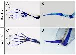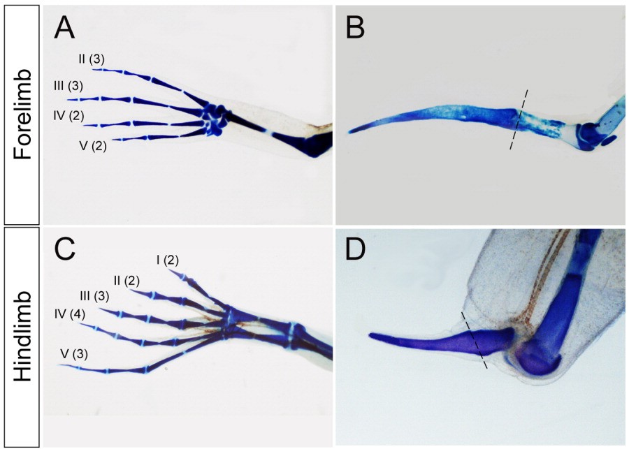 Figure 4. Skeletal patterns of normal limb and spike. A: Normal forelimb of the froglet. B: Forelimbspike. C: Normal hindlimb of the froglet. D: Hindlimbspike. A comparison of forelimb and hindlimb spikes shows that they have similar structures. The numbers in parentheses are the numbers of phalanges. Broken lines in B and D indicate the amputation site.