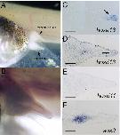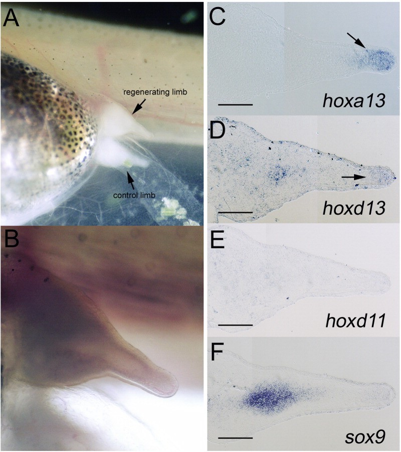 Figure 5. Skeletal preparation of hindlimb regenerate and normal limb bud treated with cyclopamine. A: Lateral view of cyclopamine-treated limb bud and regenerate. Amputation was performed at the paddle stage (stage 52), and then samples were reared in 2 mu g/ml cyclopamine. B: Higher magnificent of A. C-F: Gene expression of cyclopamine-treated blastema. C:Hoxa13 expression was detected in the distalmost region (arrow). D:Hoxd13 transcription was also weakly detected (arrow). E:Hoxd11 expression was not observed in the cyclopamine-treated sample. F:Sox9 expression. The expression profile of these seems to be similar to that in a limb of the shh-deficient mouse.