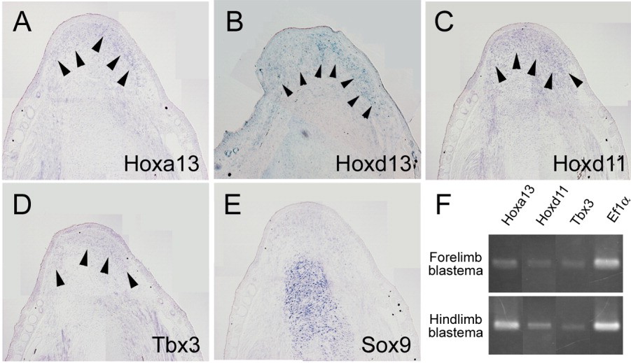 Figure 6. Gene expression in regenerating froglet blastema. Section in situ hybridization was performed 2 weeks after amputation. A:Hoxa13 was expressed in the froglet blastema (arrowheads). B:Hoxd13 expression was also detected (arrowheads). C:Hoxd11 expression was detectable (arrowheads). D:Tbx3 expression. E:Sox9 expression. F: RT-PCR analysis for forelimbblastema and hindlimbblastema of the froglet. A-E: Distal is to the top, and anterior is at the right.