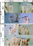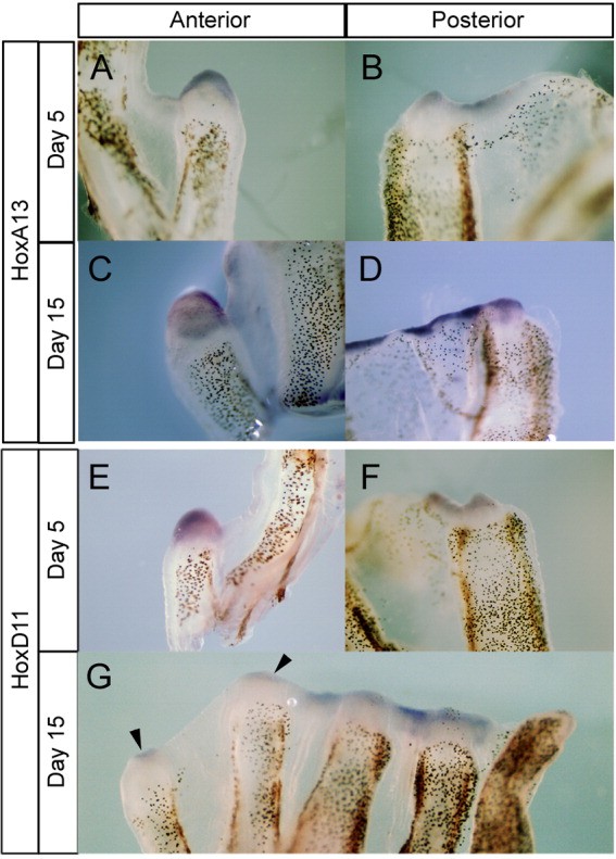 Figure 8. Hoxa13 and hoxd11 expression in digit blastemas. A-D:hoxa13 expression. Hoxa13 expression was observed throughout the anteriormost blastema to the posteriormost blastema at 5 and 15 days after amputation. Hoxa13 expression was also detectable in the web region. E-G: Hoxd11 expression. E,F: At 5 days after amputation, hoxd11 expression was detectable throughout the anteriormost blastema to the posteriormost blastema. G: At 15 days, Hoxd11 was observed throughout the anteriormost blastema to the posteriormost blastema. However, weaker signals were detected in the anterior blastemas (arrowheads).