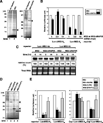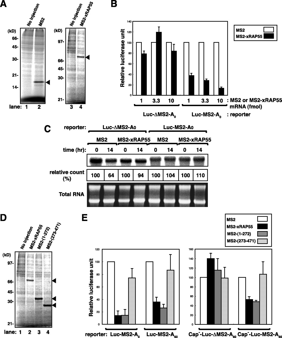 xRAP55 represses translation in vivo when tethered to an mRNA. A-C, oocytes were injected with increasing amounts of mRNAs encoding MS2 or MS2-xRAP55. Expression of MS2 and MS2-xRAP55 protein was analyzed by incubating the oocytes in [35S]methionine for 14 h (A). 6 h after the first injection, 32P-labeled and capped luciferase reporter mRNAs either containing (Luc-MS2) or not containing (Luc-ΔMS2) MS2-binding sites without poly(A) tails, together with β-galactosidase mRNA, were injected. After 14 h, oocytes were harvested, and luciferase and β-galactosidase activities were measured (B). Luciferase activity was normalized with β-galactosidase activity, and luciferase activity in oocytes expressing MS2-xRAP55 fusion protein is shown relative to the case of MS2 protein, which was set to 100%. The stability of 32P-labeled luciferase mRNAs in oocytes expressing MS2 and MS2-xRAP55 was examined immediately after microinjection (0 h) and after 14 h of incubation (C). Relative count of 32P-labeled mRNA normalized to the value in 0 h, which was 100%, is shown in boxes. Total RNA served as recovery and loading controls. D and E, effect of MS2-xRAP55-(1-272) and MS2-xRAP55-(273-471) on translational activity of capped (E, left) or uncapped (E, right) Luc-MS2 mRNAs with or without a poly(A)60 tail was examined.