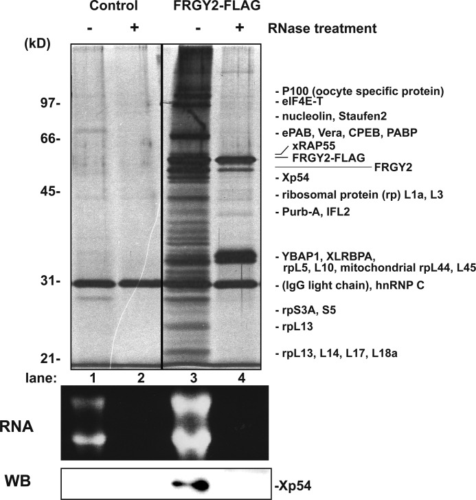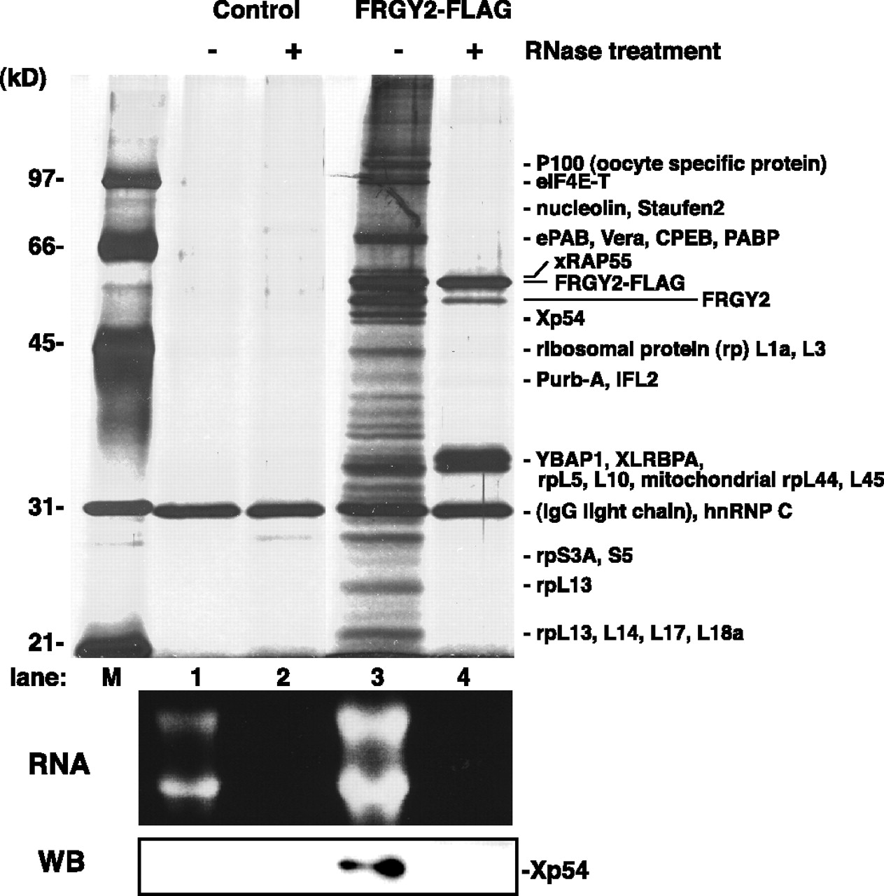 Isolation of FRGY2-associated complexes. Lysates were prepared from Xenopus oocytes expressing (lanes 3 and 4) or not expressing (lanes 1 and 2) FRGY2-FLAG and treated with RNase (lanes 2 and 4). The efficacy of RNase treatment was assessed by analyzing total RNA from the lysates (middle panel). The lysates were incubated with anti-FLAG antibody beads, and bound proteins were resolved by SDS-PAGE and detected by silver staining (top). Relevant bands in lane 3 were analyzed by mass spectrometry, and proteins identified are listed on the right. Xp54 in the immunoprecipitates was detected by immunoblotting (bottom).