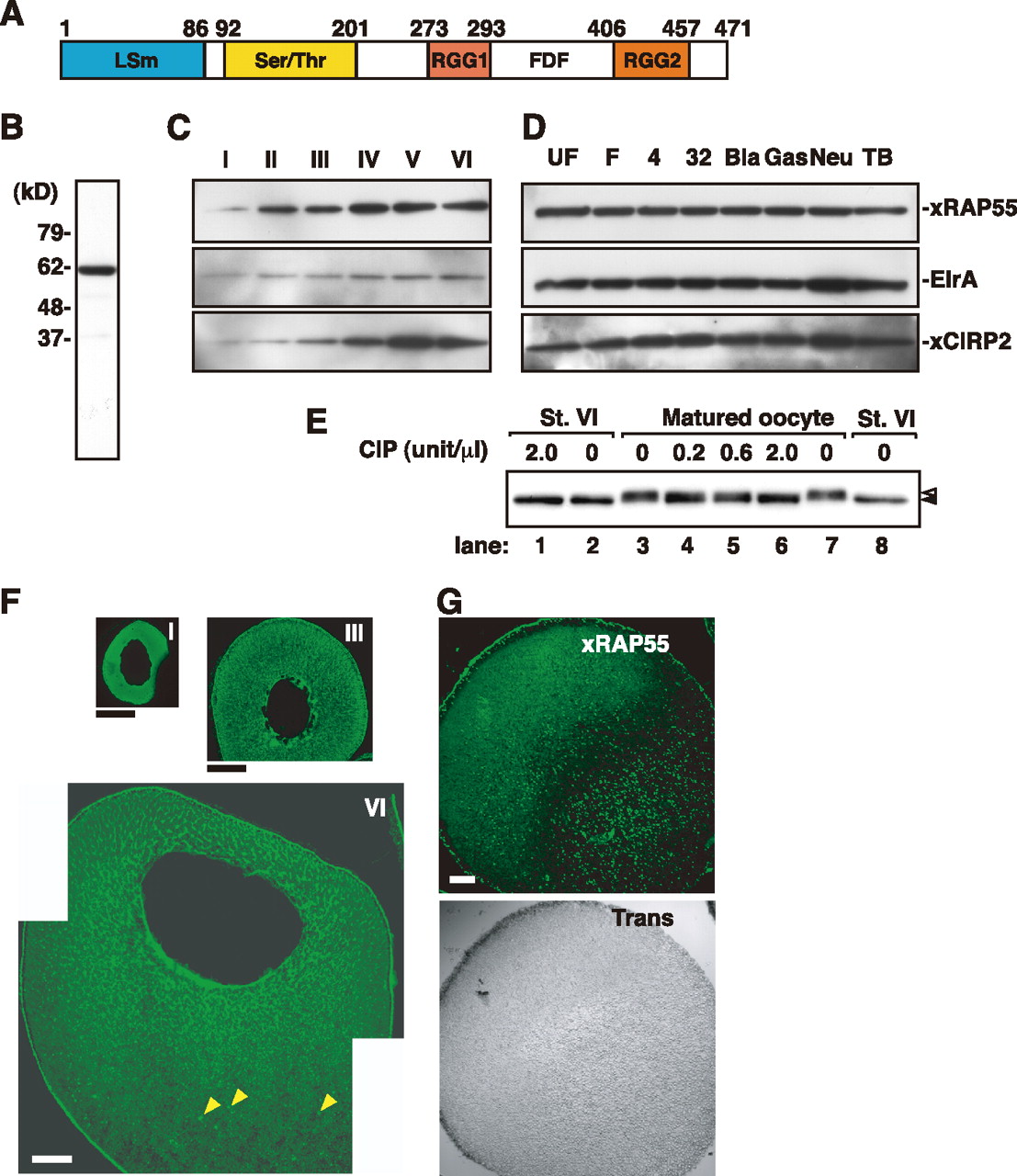 Temporal expression and subcellular localization of xRAP55. A, schematic diagram of xRAP55. xRAP55 possesses an Lsm domain and serine- and threonine-rich region (Ser/Thr) at its N terminus and two RGG-rich domains separated by an FDF domain at its C terminus. The FDF domain is a consensus motif found in Lsm13-16 proteins. B, immunoblotting of stage VI oocyte lysates with anti-xRAP55 antibody. C and D, temporal expression of xRAP55 during oogenesis (C) and early embryogenesis (D). Lysates equivalent to 0.25 oocytes (stages I-VI), unfertilized eggs (UF), fertilized eggs (F), or embryos at the 4-cell and 32-cell stages, blastula (Bla), gastrula (Gas), neurula (Neu), and tail bud (TB) were analyzed by immunoblotting. E, phosphorylation of xRAP55 in matured oocytes. Lysates from stage VI oocytes or matured oocytes were treated with calf intestine alkaline phosphatase (CIP) as indicated and analyzed by immunoblotting with anti-xRAP55 antibody. The positions of slow and fast migrating xRAP55 are indicated by open and closed arrowheads, respectively. F and G, sections of stage I, III, and VI oocytes (F) and a fertilized egg (G) were stained with anti-xRAP55 antibody. Cytoplasmic foci in a stage VI oocyte are indicated by arrowheads. A transmitted light image is also shown in G. Scale bar, 100 μm.