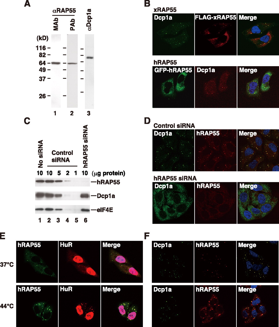 Subcellular localization of RAP55 in HeLa cells. A, HeLa cell lysates were analyzed by immunoblotting with monoclonal anti-hRAP55 (MAb, lane 1), polyclonal anti-xRAP55 (PAb, lane 2), and anti-Dcp1a (lane 3) antibodies. B (top), HeLa cells expressing FLAG-xRAP55 were stained with anti-Dcp1a (green) and anti-FLAG (red) antibodies. Bottom, HeLa cells expressing GFP-hRAP55 (green) were stained with anti-Dcp1a (red) antibody. Merged images with TO-PRO-3 staining (blue) are also shown. C and D, siRNAs were introduced into HeLa cells. Cell lysates (lanes 1, 2, and 6,10 μg of protein; lane 3,5 μg; lane 4,2 μg; and lane 5,1 μg) were analyzed by immunoblotting (C). Cells were stained with anti-Dcp1a (green) and anti-hRAP55 (red) (D). E and F, HeLa cells cultured at 37 °C or treated at 44 °C for 30 min were stained with anti-xRAP55 (green) and anti-HuR (red) antibodies (E), or with anti-Dcp1a (green) and anti-hRAP55 (red) antibodies (F).