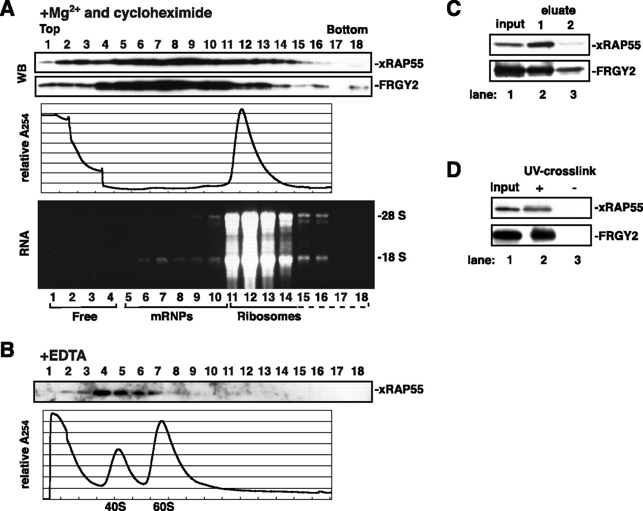 xRAP55 is a component of cytoplasmic mRNPs. A and B, stage VI oocyte lysates were fractionated on a sucrose gradient in the presence of cycloheximide (A) or EDTA (B). Proteins from each fraction were analyzed by immunoblotting with anti-xRAP55 and anti-FRGY2 antibodies. Absorbance profiles at 254 nm are shown. RNA from each fraction was electrophoresed in an agarose gel and visualized by staining with ethidium bromide (bottom panel in A). C, oocyte lysates were fractionated through oligo(dT) cellulose chromatography under native conditions. Input and bound fractions (eluates 1 and 2) were analyzed by immunoblotting. D, oocyte lysates were irradiated with UV light (lanes 1 and 2) or not irradiated (lane 3) and subjected to oligo(dT) cellulose chromatography. After extensive washes with a buffer containing SDS, bound proteins were eluted and digested with RNase. Lysates (lane 1) and eluates (lanes 2 and 3) were analyzed by immunoblotting.