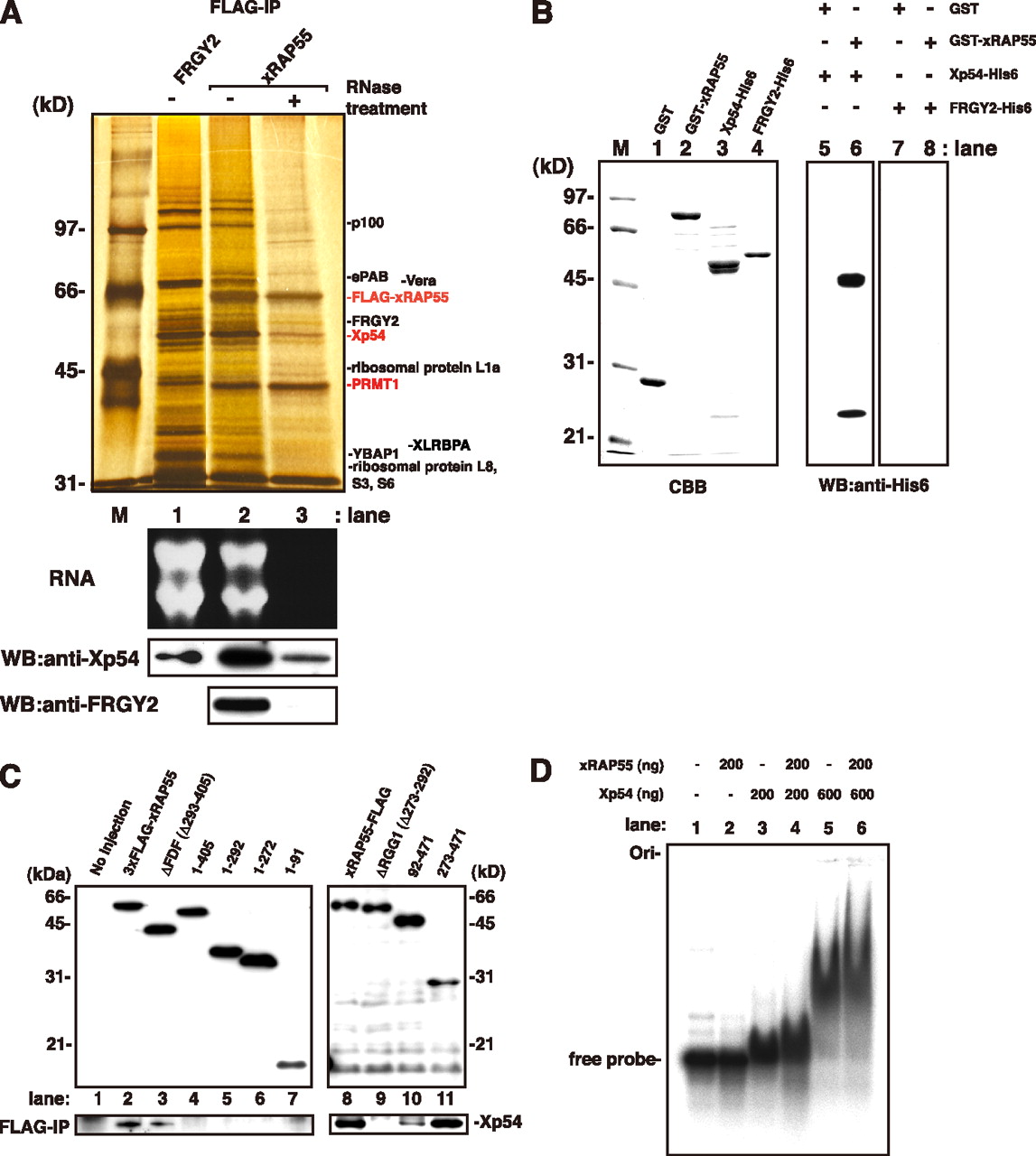 xRAP55 associates with Xp54. A, xRAP55-containing complexes. Lysates of oocytes expressing FRGY2-FLAG or 3XFLAG-xRAP55 were subjected to immunoprecipitation with anti-FLAG antibody as in Fig. 1 (top panel). Components of the immunoprecipitate from lysates of oocytes expressing 3XFLAG-xRAP55 without RNase treatment (lane 2) were identified and are listed on the right. Xp54 and FRGY2 in the immunoprecipitates were detected by immunoblotting (bottom panels). The efficacy of RNase treatment was assessed by analyzing total RNA from the lysates (middle panel). B, GST pull-down assay. Purified recombinant proteins (1 μg) were analyzed by SDS-PAGE and stained with Coomassie Brilliant Blue (lanes 1-4). GST pull-down assays were performed, and bound proteins were analyzed by immunoblotting with anti-histidine tag antibody (lanes 5-8). It should be noted that the anti-histidine tag antibody recognized the input FRGY2-His6 (not shown). C, domains of xRAP55 required for association with Xp54. Lysates of oocytes expressing various portions of xRAP55 with a FLAG or 3X FLAG tag were analyzed by immunoblotting (top), and subjected to immunoprecipitation with anti-FLAG antibody and bound proteins were analyzed by immunoblotting with anti-Xp54 antibody (bottom). D, gel-retardation assay. Recombinant Xp54-His6 and GST-xRAP55 were mixed with 32P-labeled RNA and electrophoresed in an agarose gel.