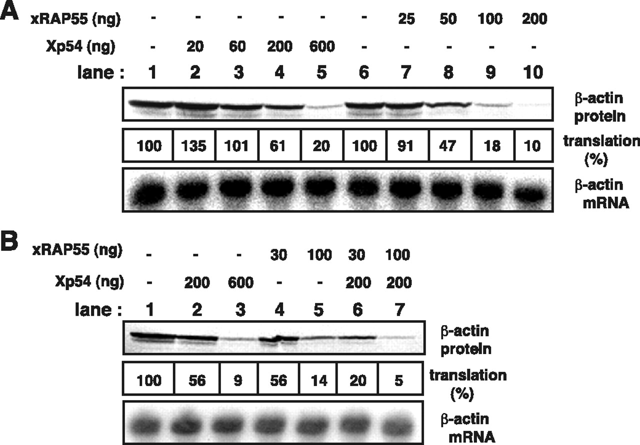 xRAP55 and Xp54 repress translation in vitro. Recombinant proteins were added to an in vitro translation system programmed with 32P-labeled β-actin mRNA in the presence of [35S]methionine. Translational products were analyzed by SDS-PAGE and quantified. The values were normalized to the value in lanes 1 and 6 in A and lane 1 in B. After the translation reaction, template mRNAs were recovered and analyzed in an agarose gel.