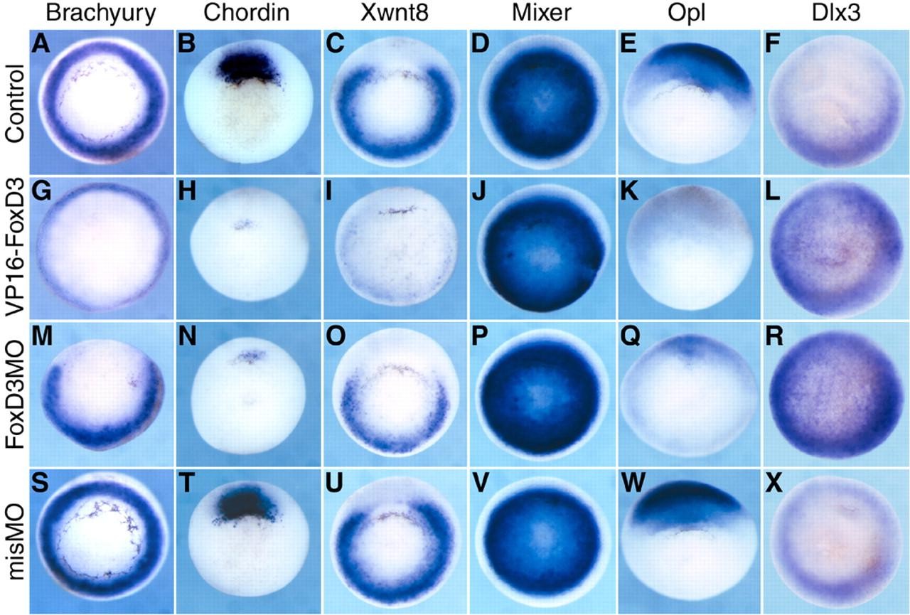 Fig. 5. Mesodermal gene expression is dependent on FoxD3 function. (A-F) Control. At the four-cell stage, each blastomere was injected in the marginal zone with 500 pg of VP16-FoxD3 RNA (G-L), 25 ng of FoxD3MO (M-R), or 25 ng of mismatch MO (S-X). At the early gastrula stage (stage 10.25), embryos were analyzed by in situ hybridization for the expression of the indicated genes. The results shown are representative of three independent experiments (n=12-18 embryos per sample in each experiment). Vegetal views are shown for Brachyury, Chordin, Xwnt8, Mixer and Opl, animal views are shown for Dlx3, and dorsal is up for all panels. |