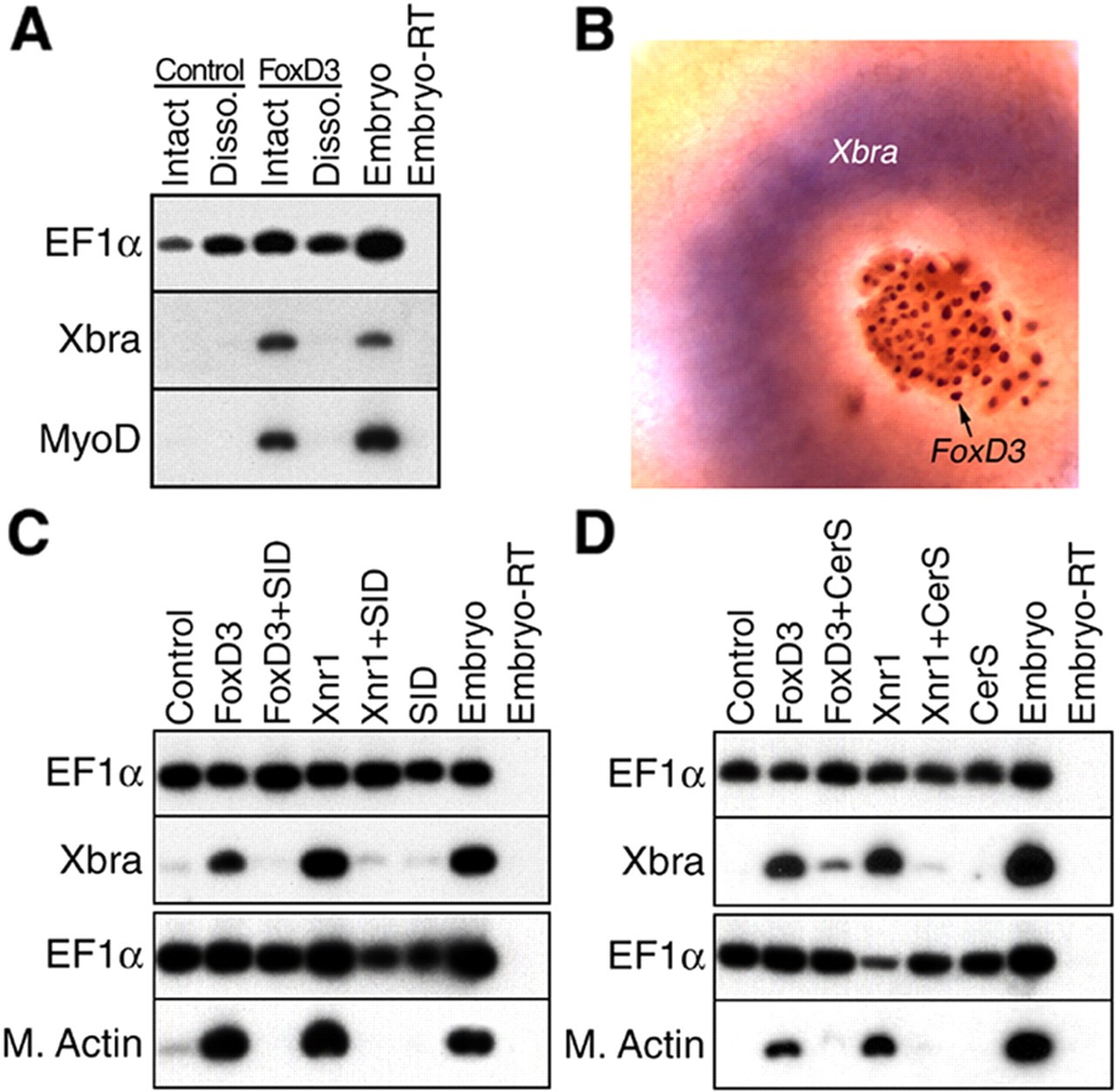 Fig. 6. Mesoderm induction by FoxD3 is non-cell-autonomous and dependent on the Nodal pathway. (A) At the one-cell stage the animal pole was injected with 100 pg of FoxD3 RNA and animal explants prepared at the early blastula (stage 7) were cultured intact or dissociated into individual cells in the absence of calcium (Disso.). The expression of Brachyury (Xbra), and MyoD was examined in uninjected (Control) and injected explants by RT-PCR at the gastrula stage (stage 11). (B) At the 32-cell stage a single animal pole blastomere was injected with 100 pg of FoxD3 RNA and explants prepared and fixed at the early gastrula stage (stage 10.5) were sequentially examined for Brachyury (Xbra) expression by in situ hybridization and FoxD3 protein expression by immunocytochemistry. To assess the dependence of FoxD3 function on Smad2 and Nodal, FoxD3 (100 pg) was injected alone, or in combination with 1 ng of the Smad2-interaction domain of Fast1 (SID) (C) or 1 ng of a truncated form of Cerberus (CerS) (D). Animal explants prepared at the midblastula stage (stage 9) were collected for RT-PCR analysis of Brachyury (Xbra) at the gastrula stage (stage 11) and Muscle Actin (M. Actin) at the tailbud stage (stage 25). Xnr1 (50 pg) was used as a positive control for the inhibitory activity of SID and CerS. PCR controls are as described in Fig. 2. |