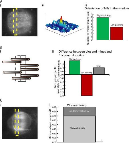 Figure 1. Schematic of method for determining the fractional densities of plus and minus ends in a portion of the spindle. (A) Measurement of the density of left- and right-pointing MTs. (i) Cross-correlation measures flow of speckles within the window (dashed box). The two peaks represent the flow toward each amount of the two poles. (ii) The volume of each peak gives the number of microtubules in the window fluxing in each direction. MTs moving left are assumed to have plus ends pointing right. (iii) Orientation of MTs in the window. (B) Calculation of the difference between fractional densities of plus and minus ends. (i) The number of right-pointing MTs is compared with the number in the adjacent window to the right. The change measures the difference in the number of plus versus minus ends in the window. This is because MTs with no ends in the two windows extend through both. MTs with plus ends extend only through the left window, while those with minus ends only through the right window. The difference between fractional densities of minus versus plus ends for left-pointing MTs is calculated in a similar manner, by comparing the number of left-pointing MTs with the number in the window to the left. The total difference is the sum of the left- and right-pointing differences. (ii) Difference between plus and minus end fractional densities. (C) Measurement of the density plus ends and calculation of the minus end fractional density. New tubulin incorporates into growing plus ends. The total number of plus ends in the window is found by measuring how quickly fluorescence intensity increases immediately after the addition of labeled tubulin. The fractional density of plus ends is added to the difference between plus and minus end fractional densities. This gives the fractional density of minus ends in the window. (ii) Fractional density of minus ends in the window.