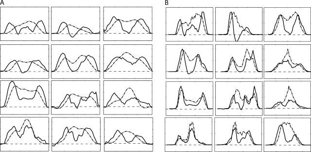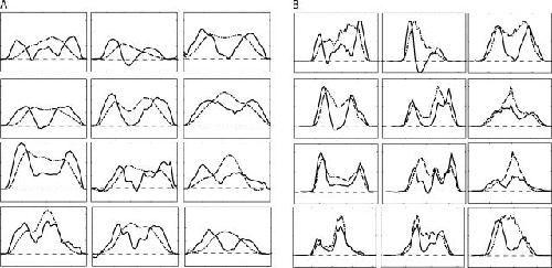 Figure 3. Plus and minus end density distributions. (A) A gallery of minus- (solid) and plus-end (dotted) fractional density distributions versus position along spindle-pole axis. The distance between tick marks on the x axis is 10 μm. Tick marks on the y axis represent 0.05 ends/μm, and dashed lines are at 0 ends/μm. (B) Plots of minus (solid) and plus end (dotted) density distributions, for the same spindles shown in A. X ticks represent 10 μm, and the y axes are in arbitrary units with dashed lines at 0.