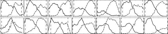 Figure 2. Oriented MT number distributions. Plots for 14 spindles showing oriented MT number distribution, in arbitrary units, versus position along the spindle-pole axis. Distributions for right-pointing MTs are given in solid lines, and distributions for left-pointing MTs are given in dotted lines. Spindle-pole positions, which were manually selected by the edge of visible florescence in spindle images, are marked with vertical dashed lines. The distance between tick marks on the x axis is 10 μm.