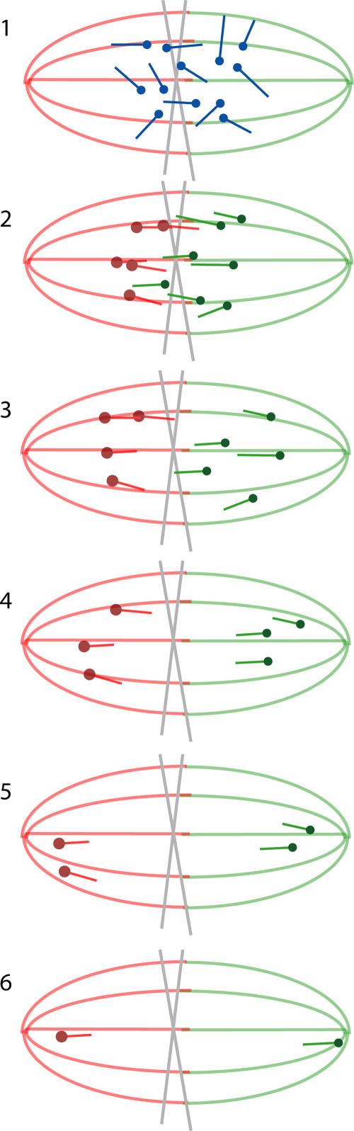 Figure 4. Model of steady-state spindle formed by chromosomal nucleation and stochastic MT loss. A steady-state spindle might be maintained through chromosomal nucleation, poleward sliding of MTs caused by the flux mechanism, and MT slowdown upon approach to the poles. (1) MTs are nucleated in a region around the chromosomes. (2) They initially point in random directions, but are sorted by motors to be parallel with the dominant MT orientation at the point of nucleation. (3–6) The MTs are moved poleward by a flux mechanism. Throughout the process, MTs and their minus ends disappear stochastically. As MTs disappear, new ones are continuously nucleated near the center.