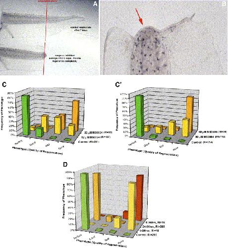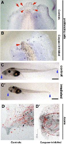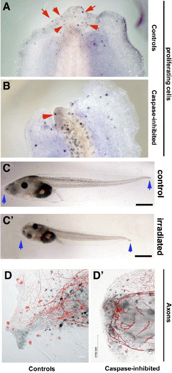 Fig. 4. Apoptosis inhibition results in inhibition of cell proliferation and neuronal mispatterning near the amputation site. Legend: H3P-positive cells are easily distinguishable from pigment cells by their color (blue vs. brown) and morphology (dendritic melanocytes vs. small round nuclear H3P stain). (A) Control larvae at 48Â hpa contain many proliferating cells in the growth region (identified by staining for phosphorylated Histone 3B, a marker of G2/M transition; four such cells are indicated by red arrowheads; average was 65). (B) In contrast, larvae treated with apoptosis inhibitor have many fewer cells at the G2/M transition in their growth region (average of 32, SD = 9.3, p < 0.01 compared to controls). When placed side by side with control animals (C), irradiated animals are significantly shorter and narrower (Câ²); this effect of global reduction of cell proliferation was not observed in drug-treated embryos (compare embryotrunk widths in Fig. 2A), showing that a direct and general inhibition on cell proliferation was not associated with exposure to apoptosis inhibitors. At 72Â hpa, staining for axons reveals the early presence of neurons throughout the regeneration bud. In contrast to control regeneration where axons run parallel to the tail's main axis (D), apoptosis-inhibited larvae's axons do not extend all the way to the end of the regeneration bud and are present in tangles, often curling perpendicular to the main axis (Dâ²). Dorsal is to the left in panels A and B.