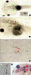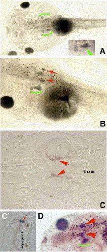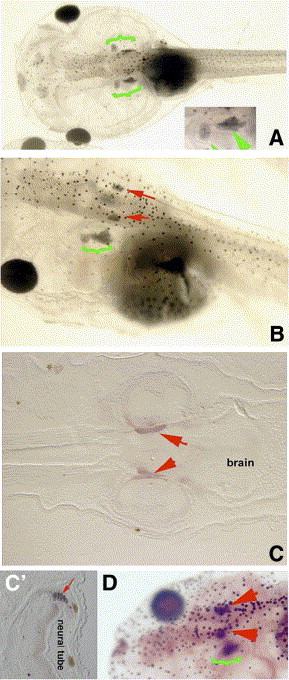 Fig. 3. Apoptosis inhibition results in ectopic otoliths. Legend: At st. 46, control larvae possess two otoliths that are visible lateral to the neural tube from the dorsal view (A, green brackets, close-up inset). Larvae exposed to apoptosis inhibitor between stages 40 and 46 develop two ectopic otoliths located medialâdorsal and adjacent to the endogenous otoliths (B). (C) Sectioned larva stained for mineralized tissues (red arrows) revealing the ectopic mineralized tissues to be located outside and medial to the otocyst, possibly within braintissue; normal otoliths occur ventral to the position of the ectopic otoliths and are thus not present in this planar section. (Câ²) Transverse section showing ectopic otolith (red arrow) next to the neural tube (the two brown circles are melanocytes). (D) Staining for mineralized tissue in whole mount also reveals ectopic otoliths (red arrows) in the hindbrain. Green bracket indicates endogenous otoliths. Red arrowheads indicate ectopic otoliths. Anterior is to the right in panel C, and to the left in panels A, B and D.