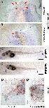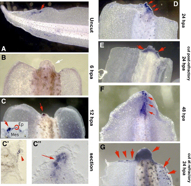Fig. 1. Endogenous pattern of apoptosis in Xenopus regeneration. Legend: Larvae were processed for immunohistochemistry with an antibody to activated caspase-3, a marker of apoptosis. Positive signals are deep purple. Hpa labels on each panel indicate stage in hours-post-amputation. Larvae in panels BâE were amputated at st. 40; the animal in panel A was not amputated, and that in panel G was amputated during the refractory period (st. 46). (A) Intact larvae at st. 45 possessed small numbers of randomly distributed apoptotic cells; tails at all stages both before and after this period exhibited the same pattern. Red arrowhead indicates one set of positive cells. (B) Six hours post-amputation, no specific signal was detected near the wound swelling. (C) At 12 hpa, a discrete focus of caspase-3-positive cells is located in the nascent regeneration bud (red arrow). Inset: sectioning reveals an epithelial component to the staining that is not obvious in a whole mount, shown also in superficial (Câ²) and deep (Cʺ) sections that reveal epithelial and mesenchymal caspase-3-positive cells. (D) At 24 hpa, the apoptotic region has expanded (red arrows). (E) When amputation was performed at st. 48 (after the refractory period), tails at 24 hpa likewise exhibit a degree of apoptosis in the bud. (F) At 48 hpa, apoptosis can be detected in cells along the axis (red arrows). (G) In larvae amputated during the refractory period (st. 46), significantly more apoptosis can be detected at 24 hpa-the refractory swelling is almost entirely apoptotic in contrast to the small apoptotic region in regenerating tails, and foci of apoptotic cells can be seen extending ventrally along the amputation edge border (red arrows). Dorsal is up in panel A; dorsal is to the right in panels BâG.