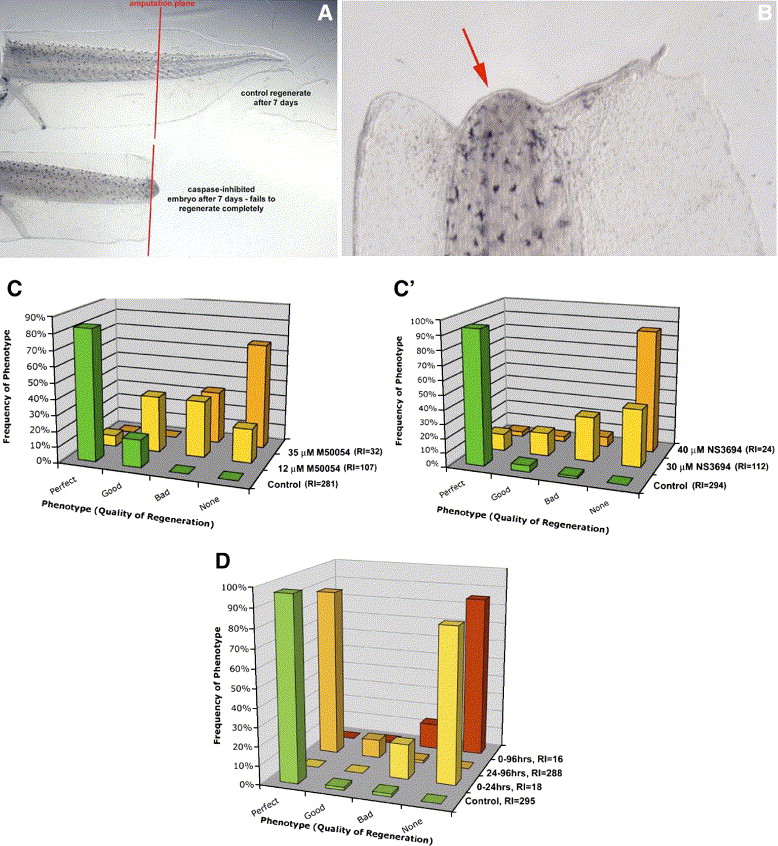 Fig. 2. Apoptosis is required for regeneration during the first 24 h. Legend: (A) In contrast to control embryos that regenerate a tail within 7 days, larvae treated with a specific apoptosis inhibitor between stages 40 and 46 completely failed to regenerate. (B) Close-up of the amputation site from an inhibited tail, 7 days after amputation. The graphs in panels C and Câ² represent averages of replicate experiments performed 3 times each. (C) The effect was concentration dependent: compared to control embryos (regeneration index 281 ± 10), those treated with 12 μM or 35 μM of the inhibitor exhibited regeneration indexes that were 38% and 12% of the controls, respectively. (Câ²) The same concentration-dependent effect was observed for NS3694, a different apoptosis blocker, significantly reducing the ability of the animals to regenerate: compared to control embryos (regeneration index 294 ± 6), those treated with 12 μM or 35 μM of the inhibitor exhibited regeneration indexes that were 38% and 8% of the controls. (D) This effect was highly time dependent: treatment that lasted only over the first 24 h post-amputation-inhibited regeneration to almost the same degree as inhibition lasting over 7 days, while inhibition that began at 24 h and continued throughout 7 days had no significant effect on regeneration. RI for three replicates combined is noted in the axis labels. Dorsal is to the top in panel A, and to the left in panel B.